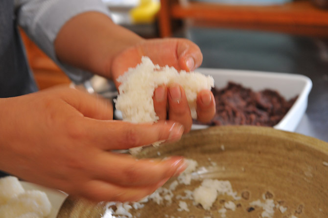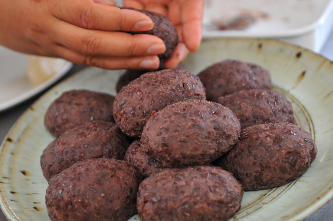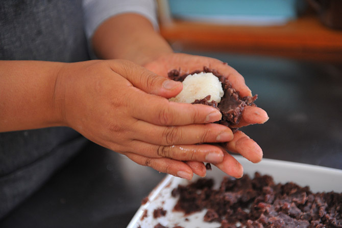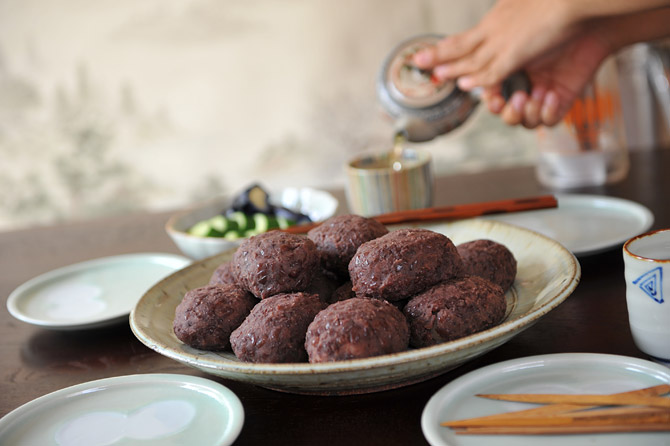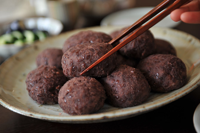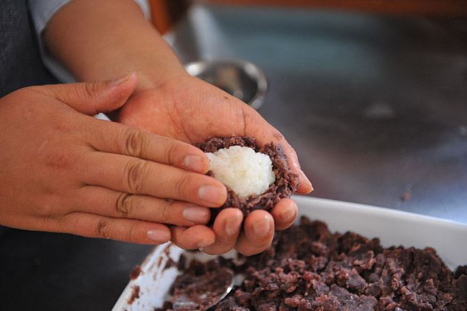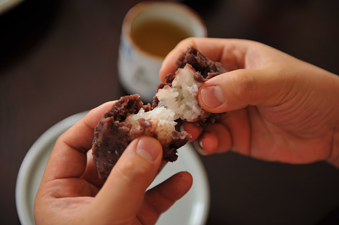 ねっとりしたごはんの入った、つぶあんのおはぎ。